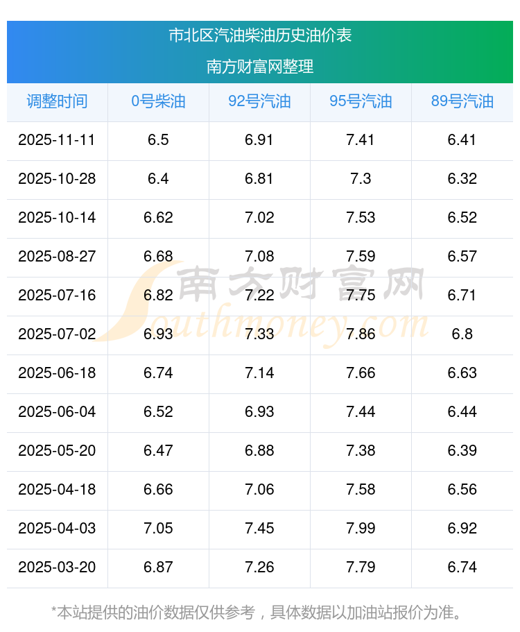 油價(jià)數(shù)據(jù)僅供參考,請(qǐng)以您所在地區(qū)的加油站報(bào)價(jià)為準(zhǔn)。南方財(cái)富網(wǎng)發(fā)布此信息的目的在于傳播更多信息,對(duì)使用該油價(jià)信息所導(dǎo)致的結(jié)果概不承擔(dān)任何責(zé)任。