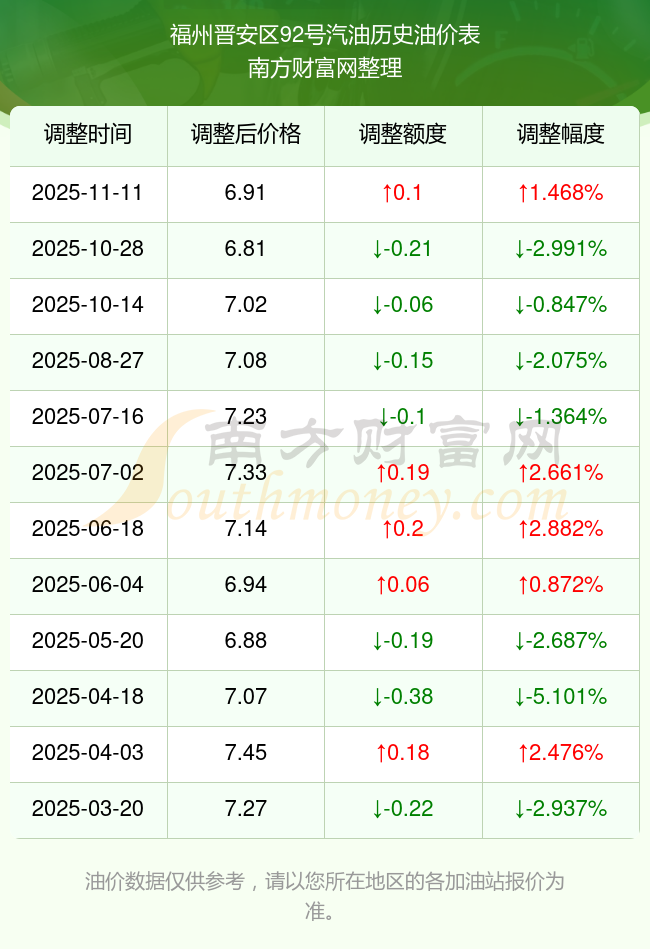 11月15日福州晉安區(qū)92號汽油的價格為11月11日調(diào)整后的價格,具體為:6.91元每升,相對上次調(diào)整時間10月28日的油價6.81元每升,增了0.1元,增幅達1.468%。