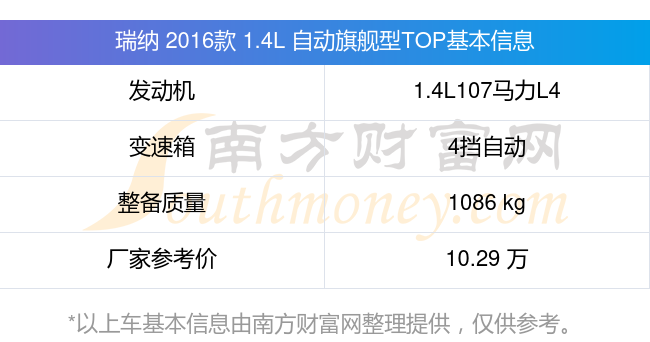 瑞納 2016款 1.4L 自動旗艦型TOP動力方面,搭載的是一臺1.4L107馬力L4自然吸氣發(fā)動機,匹配4擋自動檔變速箱,燃料形式為汽油,常規(guī)整備質(zhì)量1086kg,廠家參考價10.29萬元。