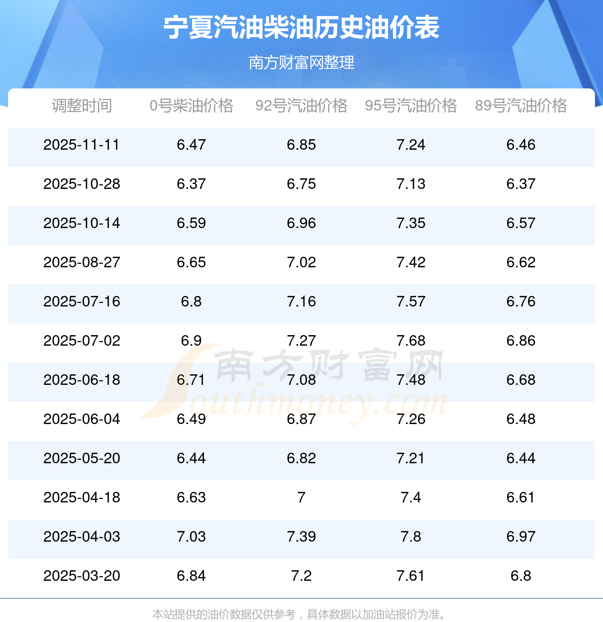 11月15日寧夏汽油、柴油每升的最新價(jià)格:92號(hào)汽油6.85元,上升了0.1元;95號(hào)汽油7.24元,上升了0.11元;89號(hào)汽油6.46元,上升了0.09;0號(hào)柴油為6.47元,上升了0.1元,本次油價(jià)調(diào)整時(shí)間是11月11日。