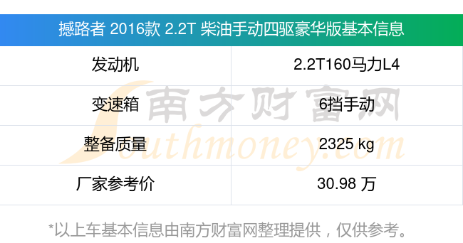 在動(dòng)力上,撼路者 2016款 2.2T 柴油手動(dòng)四驅(qū)豪華版配備的是一臺2.2T160馬力L4渦輪增壓發(fā)動(dòng)機(jī),匹配的是6擋手動(dòng)擋變速箱,燃料形式為柴油,常規(guī)整備質(zhì)量2325kg,廠家參考價(jià)30.98萬元。
