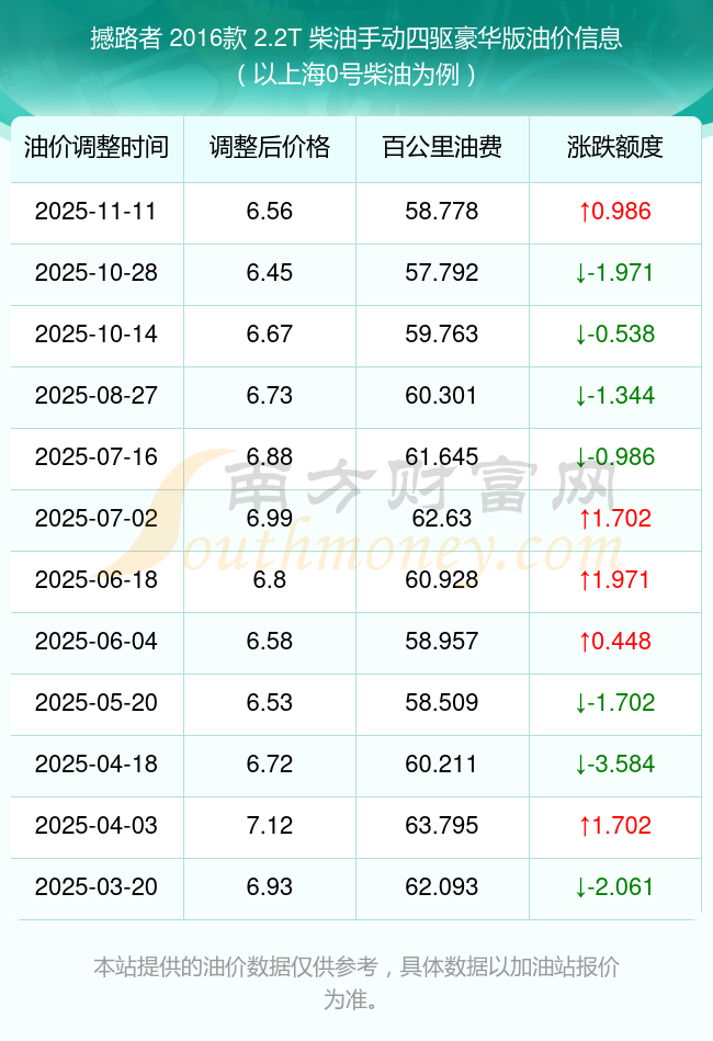 按照11月11日0號柴油最新調(diào)整價(jià)格6.56元/升來計(jì)算(以上海為例),該車型百公里平均油費(fèi)為58.778元,按照上一輪10月28日調(diào)整價(jià)格6.45元/升來計(jì)算,百公里平均油費(fèi)為57.792元,對比上一輪多花0.986元,下一輪油價(jià)調(diào)整時(shí)間為11月24日24時(shí)。