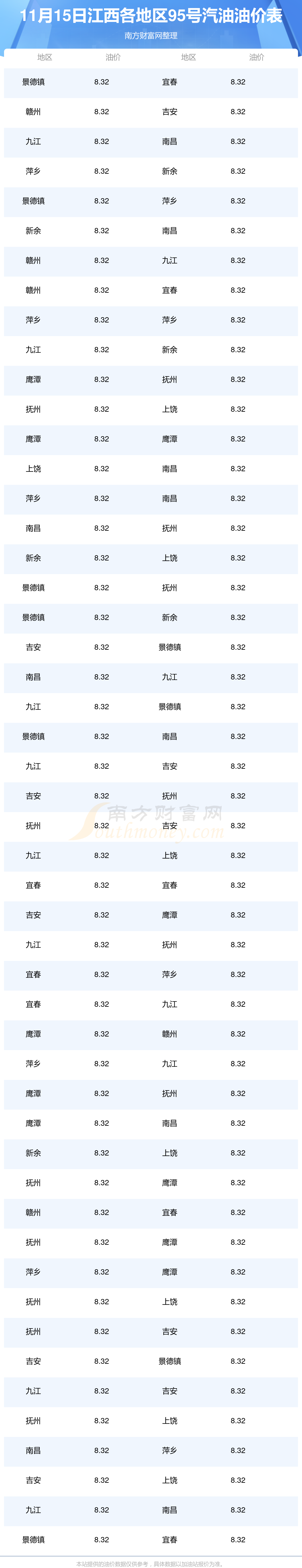 11月15日,江西95號汽油油價是7.41元每升,這是11月11日調(diào)整后的價格,相對上一輪調(diào)整增了0.1元,增1.368%。