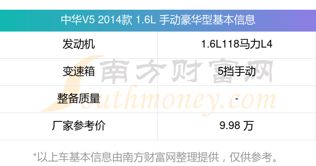中華V5 2014款 1.6L 手動(dòng)豪華型動(dòng)力方面,搭載的是一臺1.6L118馬力L4自然吸氣發(fā)動(dòng)機(jī),匹配5擋手動(dòng)擋變速箱,燃料形式為汽油,廠家參考價(jià)9.98萬元。