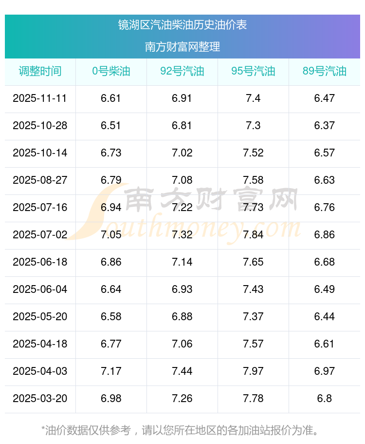 鏡湖區(qū)汽油、柴油11月15日每升的價格是多少?11月11日調(diào)整后的價格詳情如下:92號汽油6.91元;95號汽油7.4元;89號汽油6.47元;0號柴油6.61元。