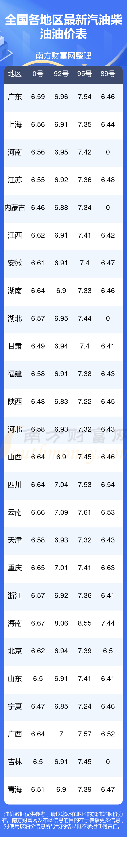 以上數(shù)據(jù)僅供參考,請(qǐng)以您所在地區(qū)的加油站實(shí)際售價(jià)為準(zhǔn)。南方財(cái)富網(wǎng)發(fā)布此信息的目的在于傳播更多信息,對(duì)使用該油價(jià)信息所導(dǎo)致的結(jié)果概不承擔(dān)責(zé)任。