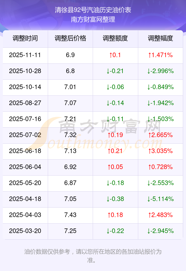 11月15日,清徐縣92號(hào)汽油今日價(jià)格(調(diào)整時(shí)間為11月11日):6.9元每升,對(duì)比上次調(diào)整(10月28日)的油價(jià)6.8元每升,共升了0.1元,升幅達(dá)1.471%。
