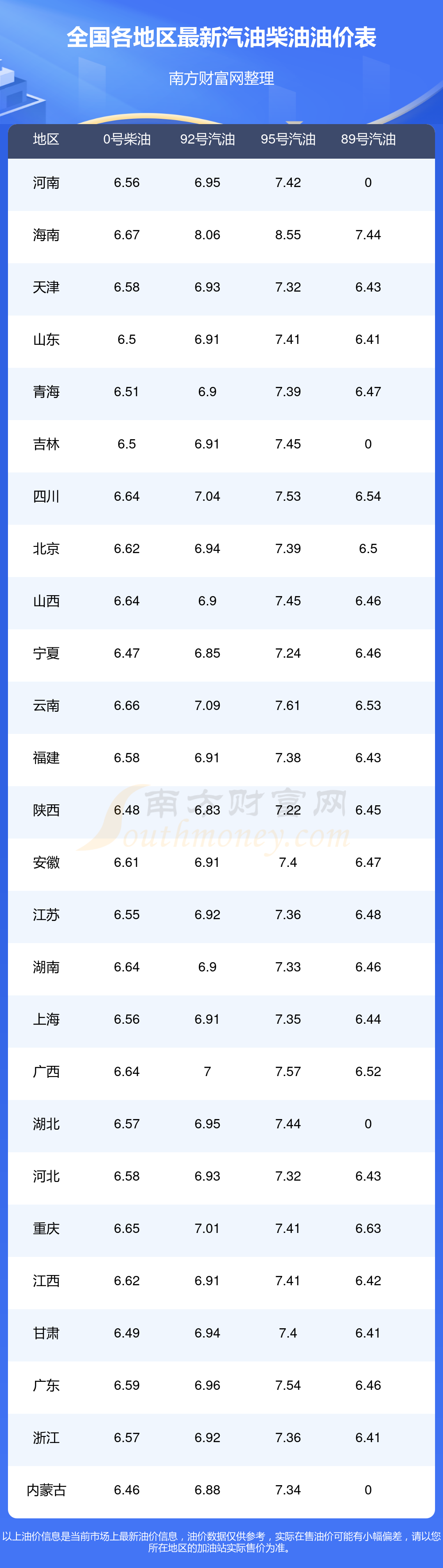 以上油價(jià)信息是當(dāng)前市場上最新油價(jià)信息,油價(jià)數(shù)據(jù)僅供參考,實(shí)際在售油價(jià)可能有小幅偏差,請以您所在地區(qū)的加油站實(shí)際售價(jià)為準(zhǔn)。
