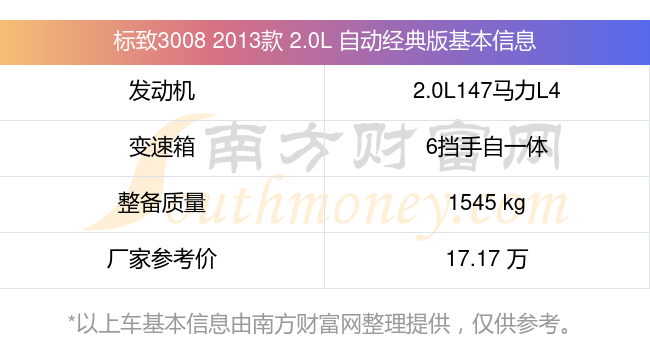 在動力上,標(biāo)致3008 2013款 2.0L 自動經(jīng)典版配備的是一臺2.0L147馬力L4自然吸氣發(fā)動機(jī),匹配的是6擋手自一體自動檔變速箱,燃料形式為汽油,常規(guī)整備質(zhì)量1545kg,廠家參考價17.17萬元。