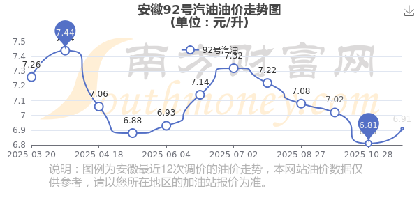 11月15日,安徽92號(hào)汽油的價(jià)格是6.91元每升,本次的調(diào)整時(shí)間為11月11日,對(duì)比上次的調(diào)整升了0.1元,升1.468%,11月24日24時(shí)為下一輪油價(jià)調(diào)整時(shí)間,還有9.23天。