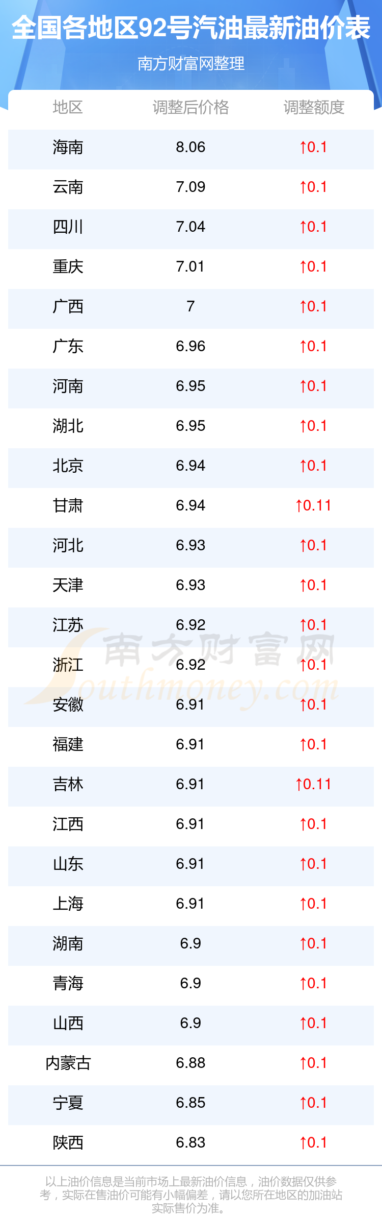 11月15日,全國92號汽油最新平均價格為:7元每升,調(diào)整時間為11月11日,其中,92號汽油最高為海南,價格為8.06元/升,全國92號汽油最低為陜西,價格為6.83元/升。