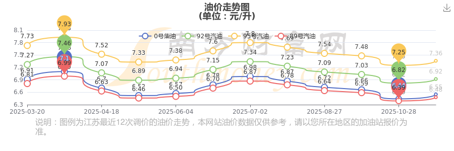 11月15日,江蘇無錫95號汽油的價格為7.36元/升,這是11月11日油價調整后的價格,對比上一輪油價調整時間10月28日的價格7.25元每升,升了0.11元,升幅達1.517%。下一輪油價調整時間11月24日24時,距離現在還有9.23天。