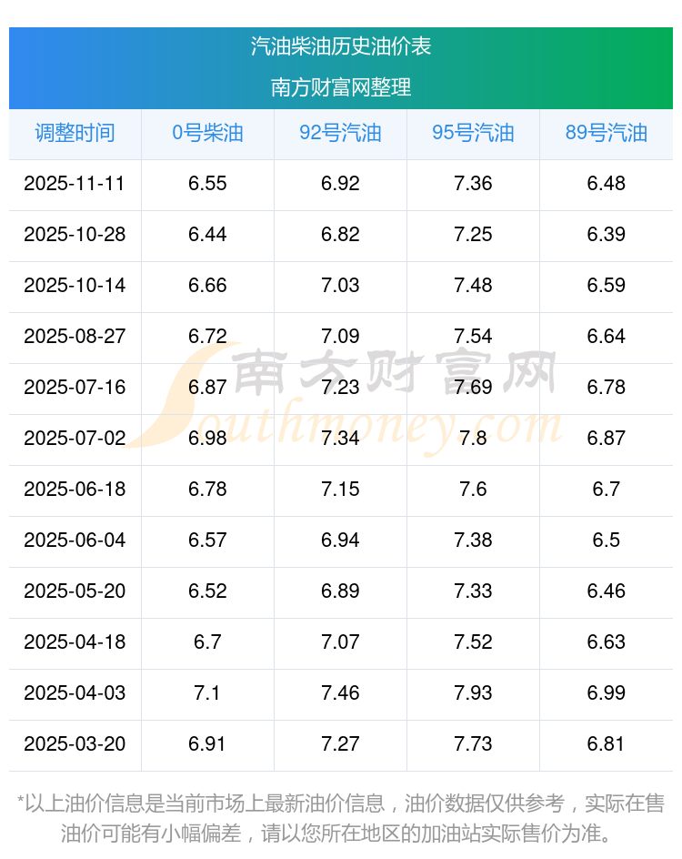 2025年95號汽油價格一覽表
