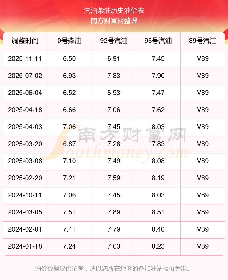 11月15日延邊汽油、柴油價格是多少錢一升?11月11日油價調(diào)整后,每升油價為:92號汽油為6.91元,升了0.11元,升幅達(dá)1.62%;95號汽油為7.45元,升了0.11元,升幅達(dá)1.5%;0號柴油為6.5元,升了0.1元,升幅達(dá)1.56%。下一輪油價調(diào)整時間11月24日24時,距離現(xiàn)在還有9.22天。