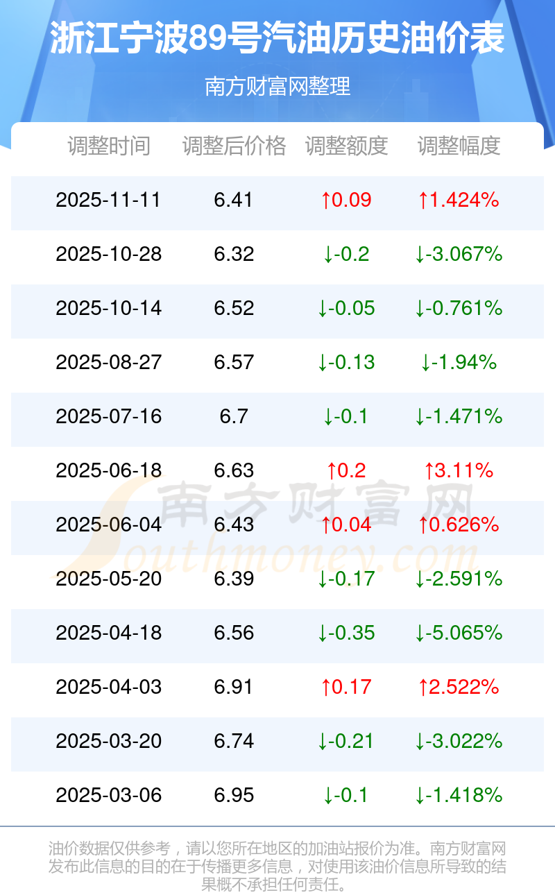 11月15日,浙江寧波89號汽油的價格為6.41元/升,這是11月11日油價調整后的價格,對比上一輪油價調整時間10月28日的價格6.32元每升,上漲了0.09元,上漲幅達1.424%。