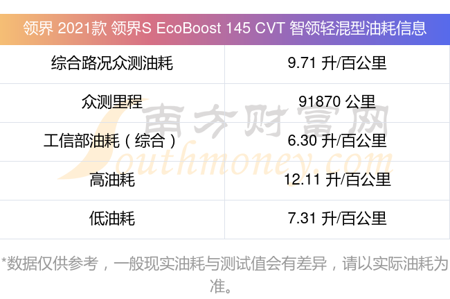 根據多位車主實測得出數(shù)據,該車型低油耗為7.31升每百公里,高油耗為12.11升每百公里,綜合路況眾測油耗為9.71升每百公里,工信部綜合油耗為6.30升每百公里。