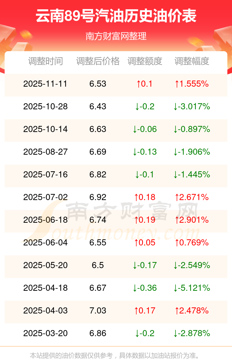 11月15日,云南89號(hào)汽油的價(jià)格是6.53元每升,本次的調(diào)整時(shí)間為11月11日,對(duì)比上次的調(diào)整升了0.1元,升1.555%,下次調(diào)整時(shí)間為11月24日24時(shí),還有9.18天。
