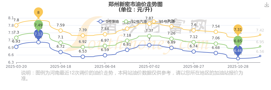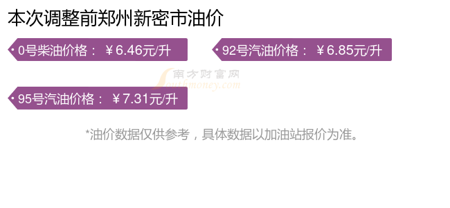 11月15日鄭州新密市汽油每升的價格為11月11日調(diào)整后的價格,具體價格如下:92號汽油6.95元;95號汽油7.42元;0號柴油6.56元。