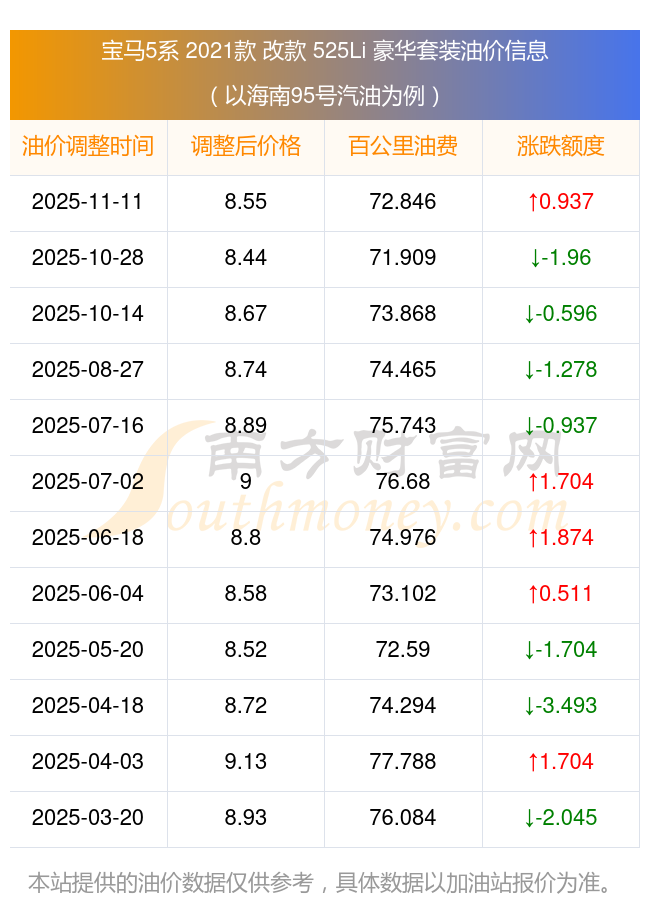 依照11月11日95號(hào)汽油最新調(diào)整價(jià)格8.55元/升來計(jì)算(以海南為例),該車型百公里的平均油費(fèi)是72.846元,依照上一輪10月28日調(diào)整價(jià)格8.44元/升來計(jì)算,百公里的平均油費(fèi)是71.909元,對(duì)比上一輪多花0.937元,下一輪的油價(jià)調(diào)整時(shí)間11月24日24時(shí)。