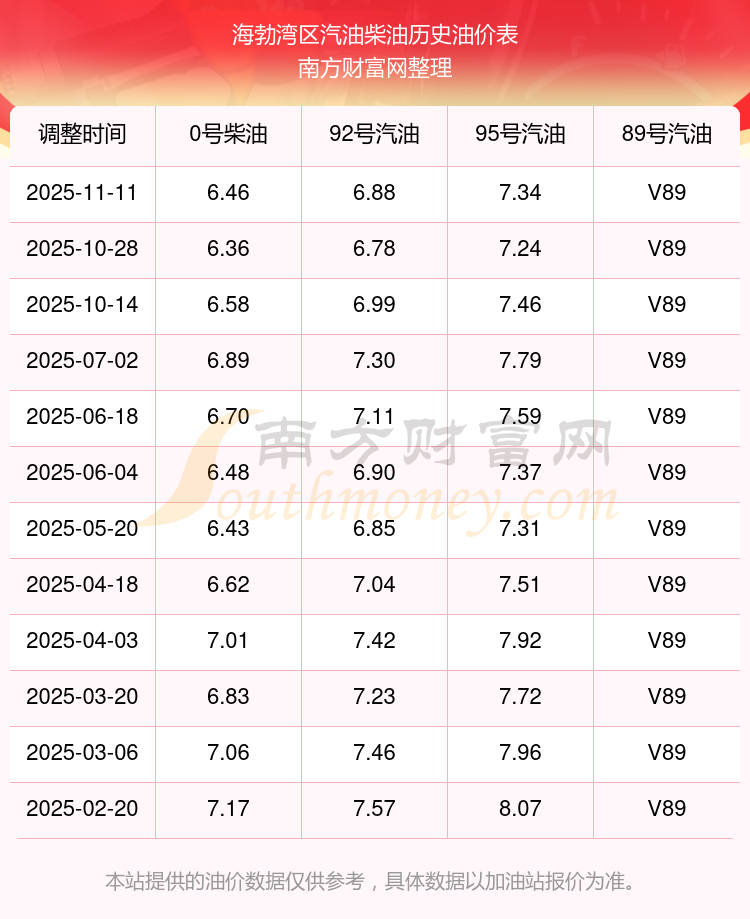油價(jià)數(shù)據(jù)僅供參考,請(qǐng)以您所在地區(qū)的各加油站報(bào)價(jià)為準(zhǔn)。