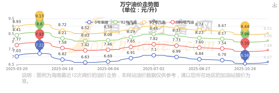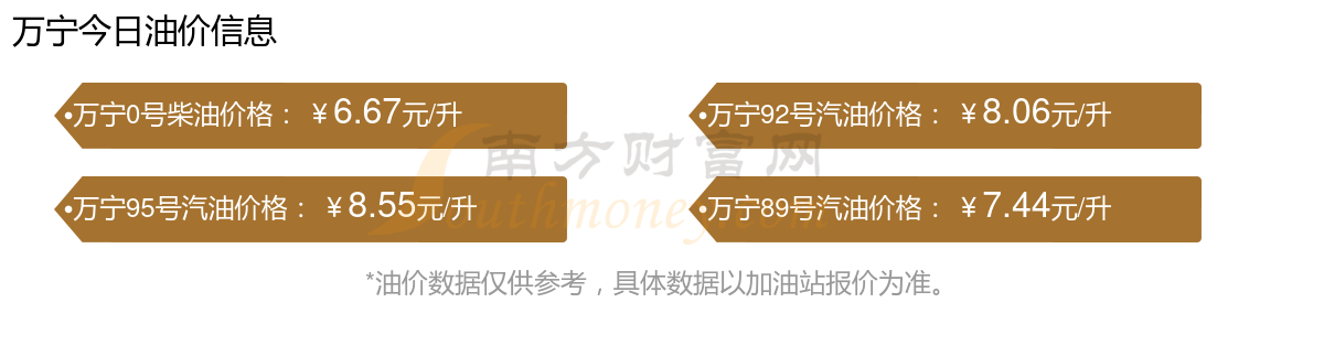 萬寧汽油、柴油11月15日每升的價格為11月11日調(diào)整后的價格:92號汽油8.06元;95號汽油8.55元;89號汽油7.44元;0號柴油6.67元。