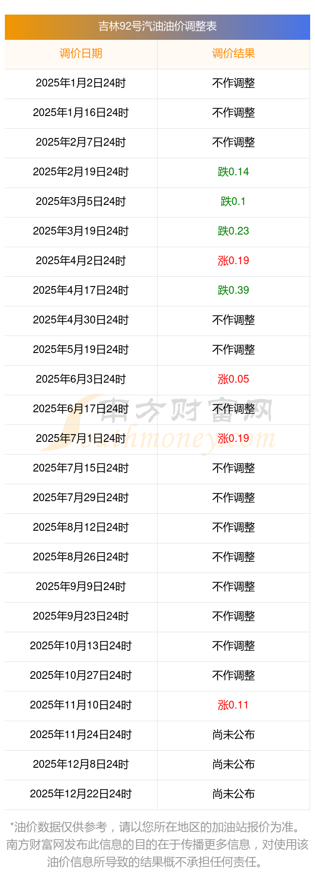 11月15日,吉林92號汽油的價格是6.91元每升,本次的調(diào)整時間為11月11日,對比上次的調(diào)整升了0.11元,升1.618%,11月24日24時為下一輪油價調(diào)整時間,還有9.13天。