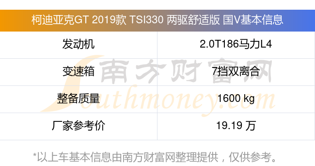 柯迪亞克GT 2019款 TSI330 兩驅(qū)舒適版 國V搭載了一臺2.0T186馬力L4渦輪增壓發(fā)動機(jī),采用7擋雙離合自動檔變速箱,常規(guī)整備質(zhì)量1600kg,廠家參考價19.19萬元。
