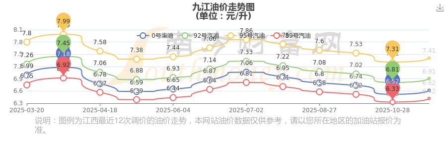 九江汽油、柴油11月15日每升的價格為(油價調(diào)整時間是11月11日):92號汽油6.91元;95號汽油7.41元;89號汽油6.42元;0號柴油6.62元。