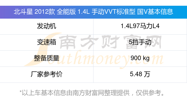 在動(dòng)力上,北斗星 2012款 全能版 1.4L 手動(dòng)VVT標(biāo)準(zhǔn)型 國V配備的是一臺(tái)1.4L97馬力L4自然吸氣發(fā)動(dòng)機(jī),匹配的是5擋手動(dòng)擋變速箱,燃料形式為汽油,常規(guī)整備質(zhì)量900kg,廠家參考價(jià)5.48萬元。