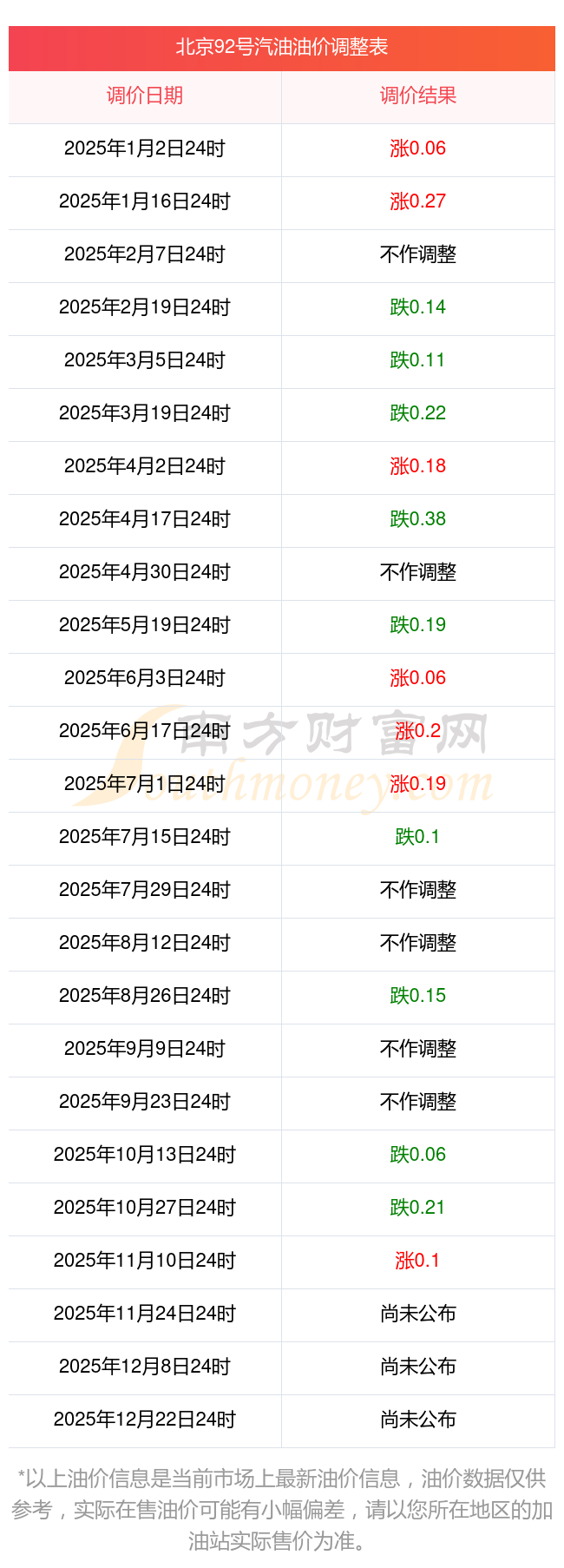 北京92號汽油油價調(diào)整表