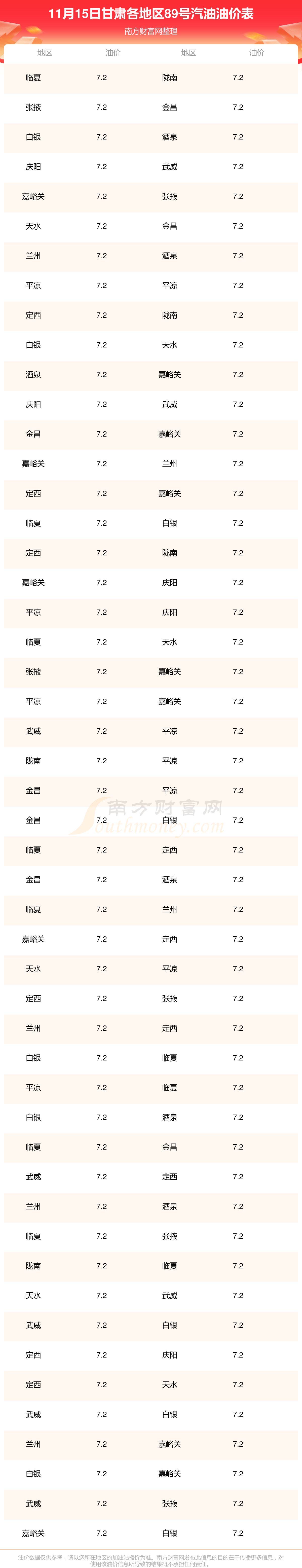 甘肅各地區(qū)最新89號(hào)汽油油價(jià)表