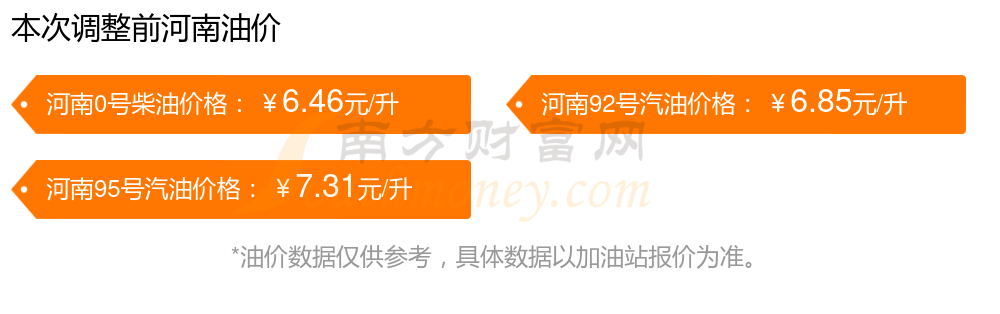 11月15日河南汽油、柴油每升最新價格多少錢一升?具體為:92號汽油6.95元,上調了0.1元;95號汽油7.42元,上調了0.11元;0號柴油為6.56元,上調了0.1元,本次的調整時間是11月11日。