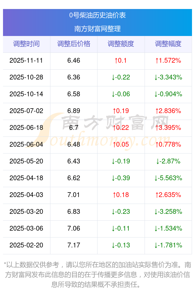 11月15日汽油、柴油每升的價格為:92號汽油為6.88元,上漲了0.1元;95號汽油為7.34元,上漲了0.1元;0號柴油為6.46元,上漲了0.1元,本輪油價的調(diào)整時間為11月11日。