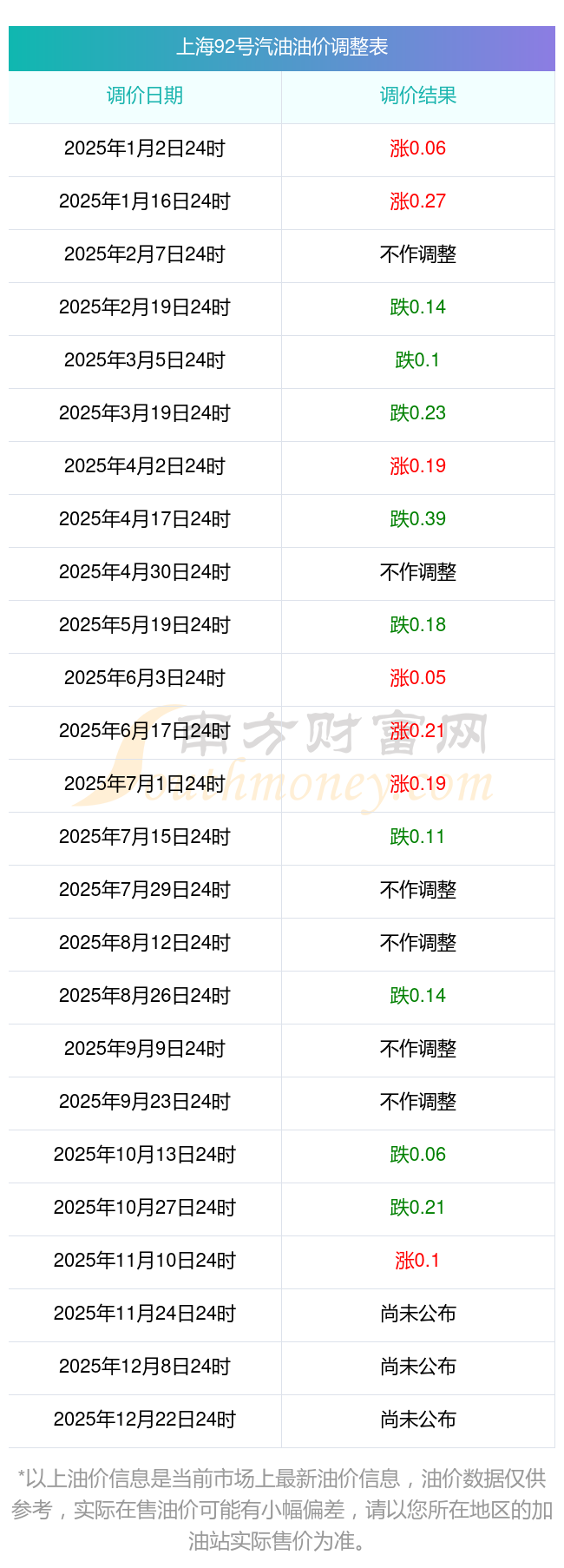 上海92號(hào)汽油油價(jià)調(diào)整表