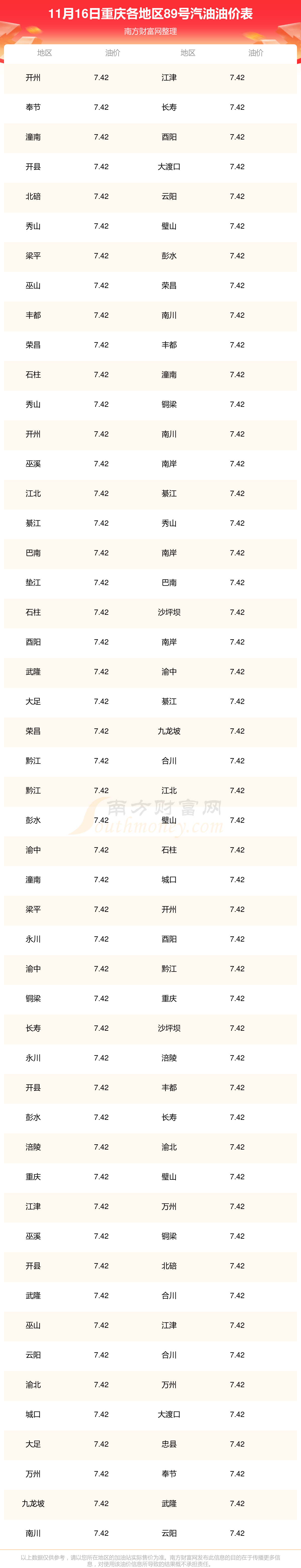 11月16日,重慶89號汽油的價格是6.63元每升,本次的調(diào)整時間為11月11日,對比上次的調(diào)整漲了0.09元,漲1.376%,下次調(diào)整時間為11月24日24時,還有8.88天。