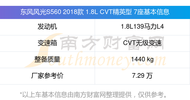 東風(fēng)風(fēng)光S560 2018款 1.8L CVT精英型 7座搭載了一臺(tái)1.8L139馬力L4自然吸氣發(fā)動(dòng)機(jī),采用CVT無(wú)級(jí)變速自動(dòng)檔變速箱,常規(guī)整備質(zhì)量1440kg,廠家參考價(jià)7.29萬(wàn)元。