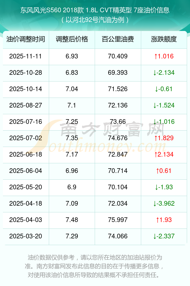 依照11月11日92號(hào)汽油最新調(diào)整價(jià)格6.93元/升來(lái)計(jì)算(以河北為例),該車型百公里的平均油費(fèi)是70.409元,依照上一輪10月28日調(diào)整價(jià)格6.83元/升來(lái)計(jì)算,百公里的平均油費(fèi)是69.393元,對(duì)比上一輪多花1.016元,下一輪的油價(jià)調(diào)整時(shí)間11月24日24時(shí)。