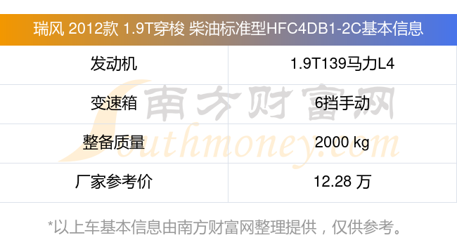 瑞風(fēng) 2012款 1.9T穿梭 柴油標(biāo)準(zhǔn)型HFC4DB1-2C動(dòng)力上配備的是一臺(tái)1.9T139馬力L4渦輪增壓發(fā)動(dòng)機(jī),匹配的是6擋手動(dòng)擋變速箱,燃料形式為柴油,常規(guī)整備質(zhì)量2000kg,廠家參考價(jià)12.28萬元。