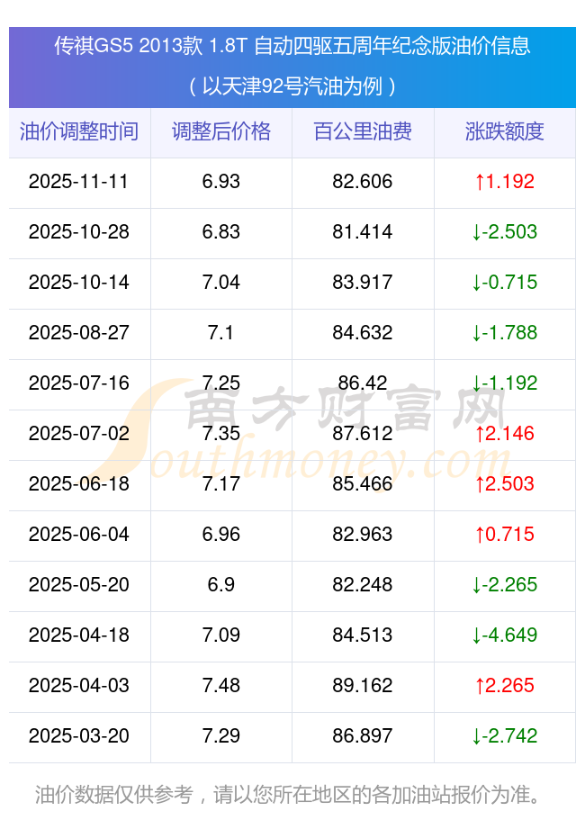 按照11月11日92號汽油最新調(diào)整價格6.93元/升來計算(以天津為例),該車型百公里平均油費為82.606元,按照上一輪10月28日調(diào)整價格6.83元/升來計算,百公里平均油費為81.414元,對比上一輪多花1.192元,下一輪油價調(diào)整時間為11月24日24時。