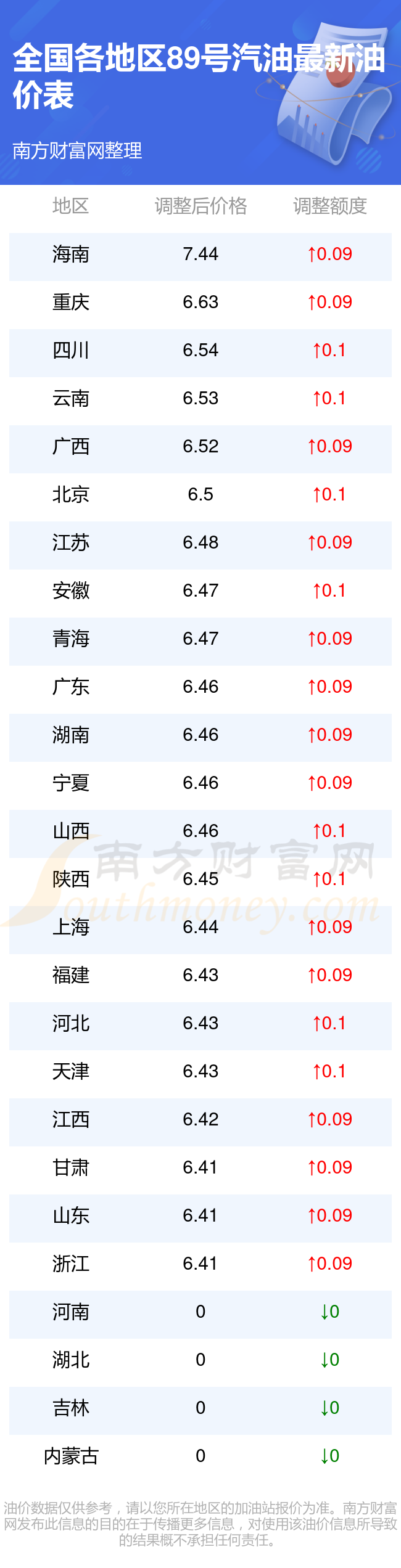 全國各地區(qū)最新89號(hào)汽油油價(jià)表