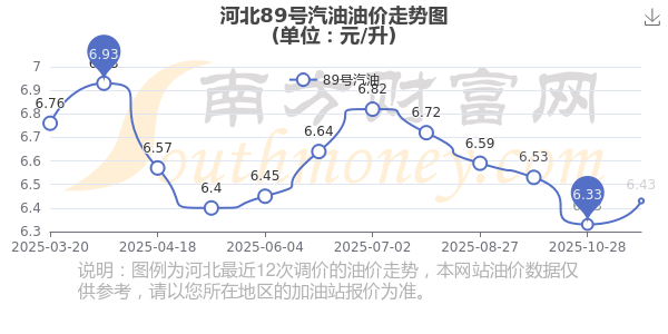 11月16日,河北89號汽油的價格是6.43元/升,本輪油價調(diào)整時間是11月11日,10月28日為上一輪油價調(diào)整時間,上次調(diào)整后河北89號汽油價格為6.33元/升,本次相比上升了0.1元,上升幅為1.58%。