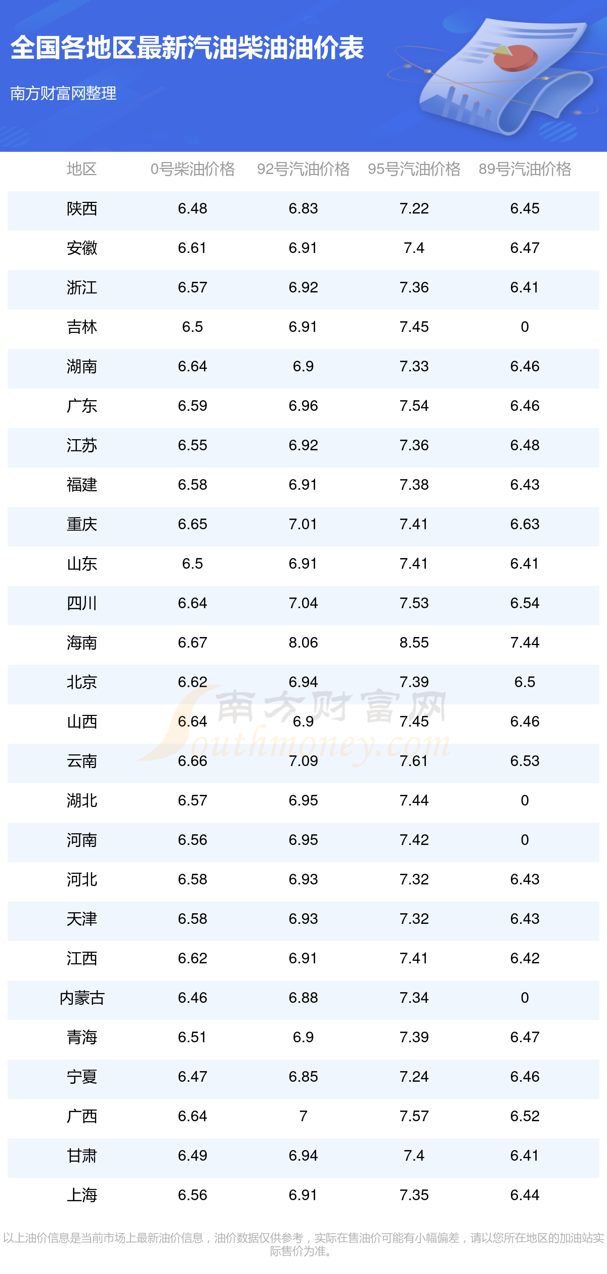 以上數(shù)據(jù)僅供參考,請(qǐng)以您所在地區(qū)的加油站實(shí)際售價(jià)為準(zhǔn)。南方財(cái)富網(wǎng)發(fā)布此信息的目的在于傳播更多信息,對(duì)使用該油價(jià)信息所導(dǎo)致的結(jié)果概不承擔(dān)責(zé)任。