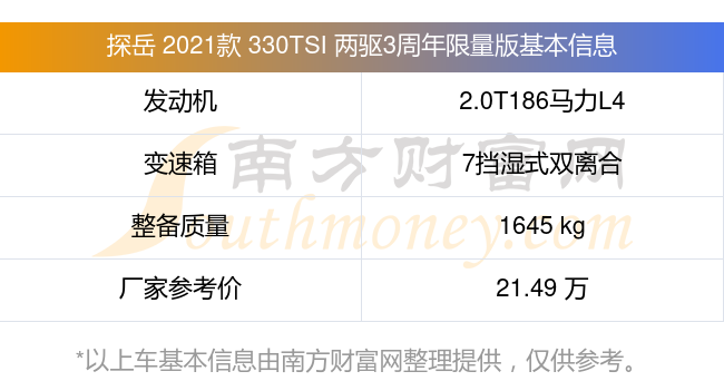 探岳 2021款 330TSI 兩驅(qū)3周年限量版動(dòng)力上搭載的是一臺(tái)2.0T186馬力L4渦輪增壓發(fā)動(dòng)機(jī),匹配7擋濕式雙離合自動(dòng)檔變速箱,燃料形式為汽油,常規(guī)整備質(zhì)量1645kg,廠家參考價(jià)21.49萬元。