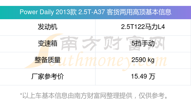 Power Daily 2013款 2.5T-A37 客貨兩用高頂動(dòng)力方面,搭載的是一臺(tái)2.5T122馬力L4渦輪增壓發(fā)動(dòng)機(jī),匹配5擋手動(dòng)擋變速箱,燃料形式為柴油,常規(guī)整備質(zhì)量2590kg,廠家參考價(jià)15.49萬元。