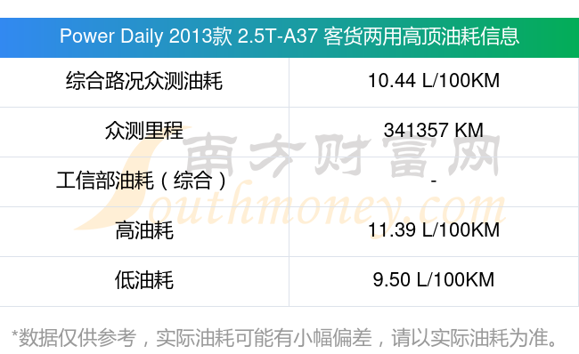 根據(jù)車主實(shí)測(cè)數(shù)據(jù),該車型低油耗為9.50升每百公里,高油耗為11.39升每百公里,綜合路況眾測(cè)油耗為10.44升每百公里。
