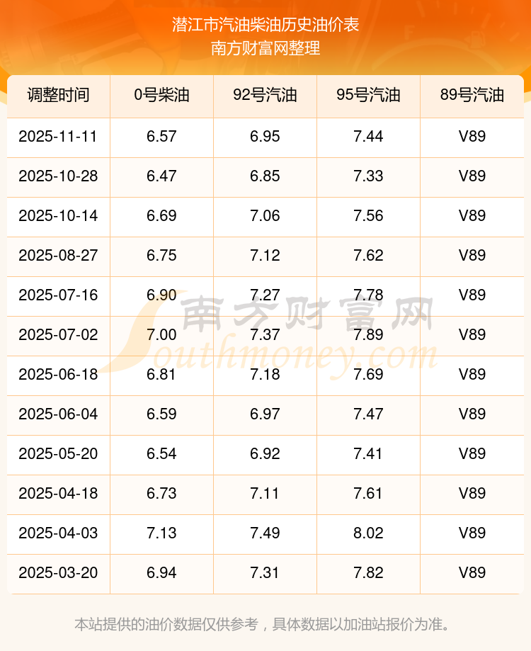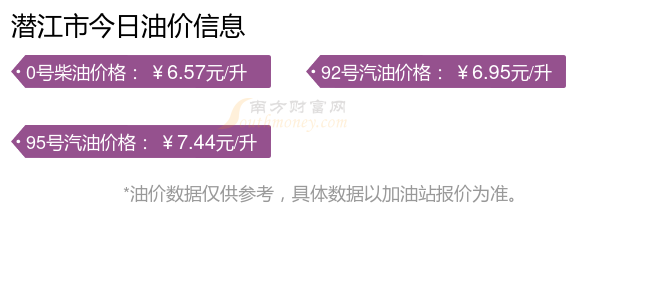 潛江市汽油、柴油11月16日每升最新價(jià)格為:92號(hào)汽油為6.95元;95號(hào)汽油為7.44元;0號(hào)柴油為6.57元,調(diào)整時(shí)間為11月11日。