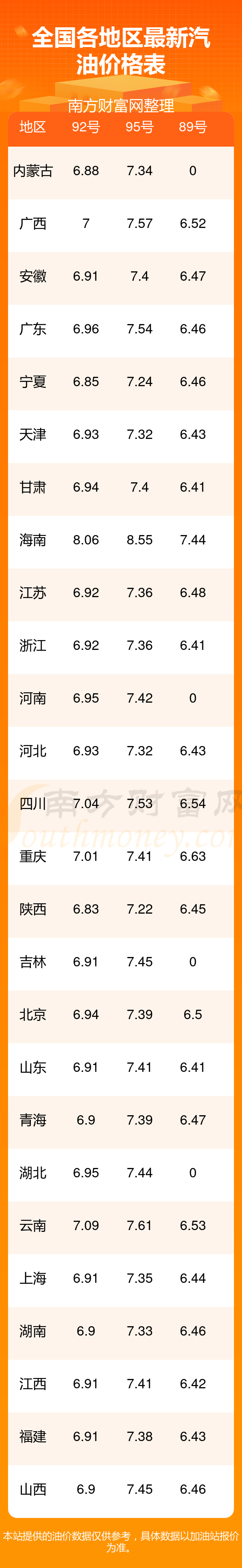 全國各地區(qū)最新油價表