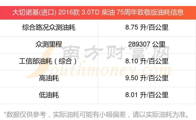 根據(jù)車主實測數(shù)據(jù),該車型低油耗為8.01L/100km,高油耗為9.50L/100km,綜合路況眾測油耗為8.75L/100km,工信部綜合油耗為8.10L/100km。