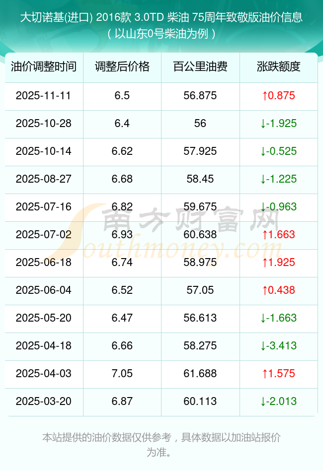 按照11月11日0號柴油最新調(diào)整價格6.5元/升來計算(以山東為例),該車型百公里平均油費(fèi)為56.875元,按照上一輪10月28日調(diào)整價格6.4元/升來計算,百公里平均油費(fèi)為56元,對比上一輪多花0.875元,下一輪油價調(diào)整時間為11月24日24時。