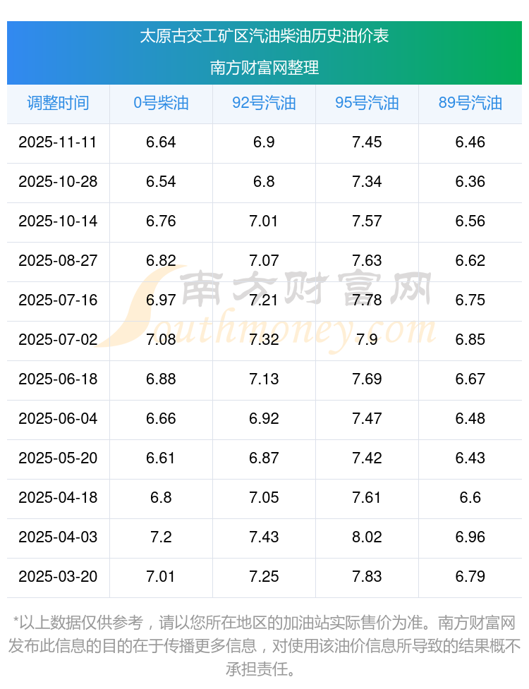 11月16日太原古交工礦區(qū)今日汽油價格如下:92號汽油6.9元;95號汽油7.45元;89號汽油6.46元;0號柴油6.64元(該價格為11月11日調(diào)整后的價格)。